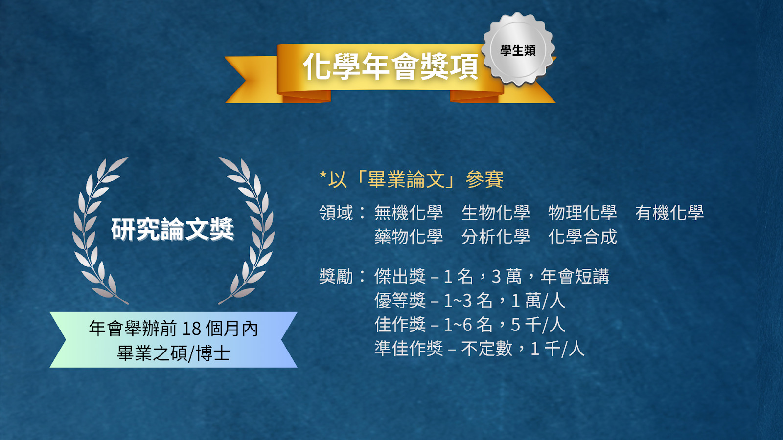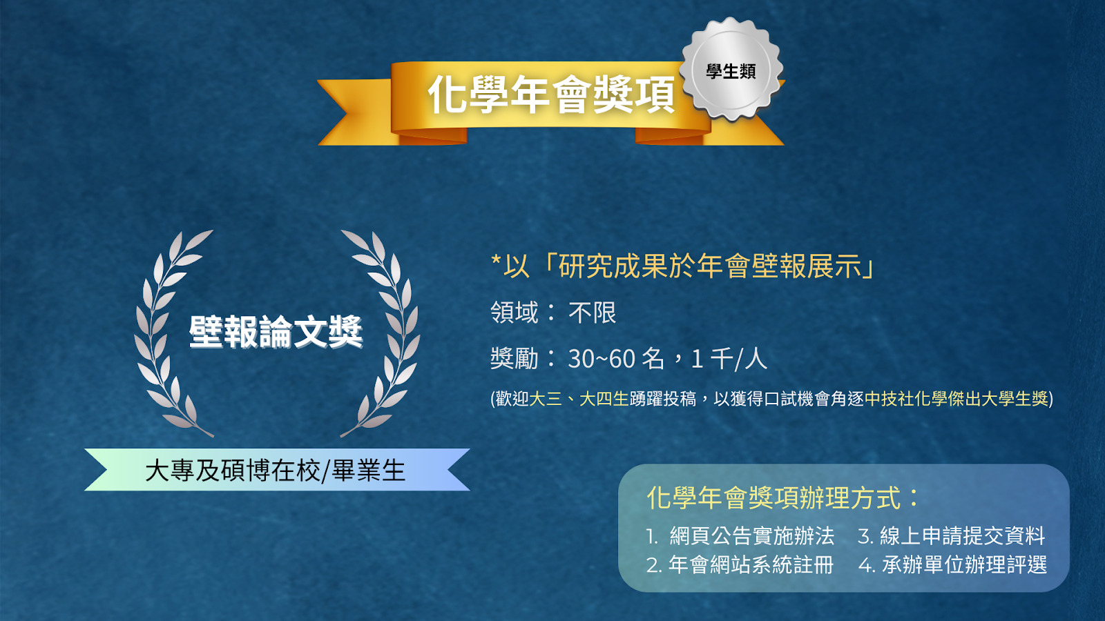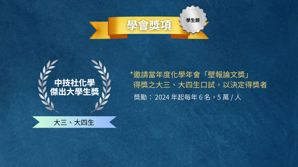 1/9前投稿可參加「壁報論文獎」,另辦理「中技社化學傑出大學生獎」,將於年會結束後通知獲「壁報論文獎」之大三、大四學生參與口試,並從中選出6人,每人獎勵台幣5萬元獎金及獎狀。
